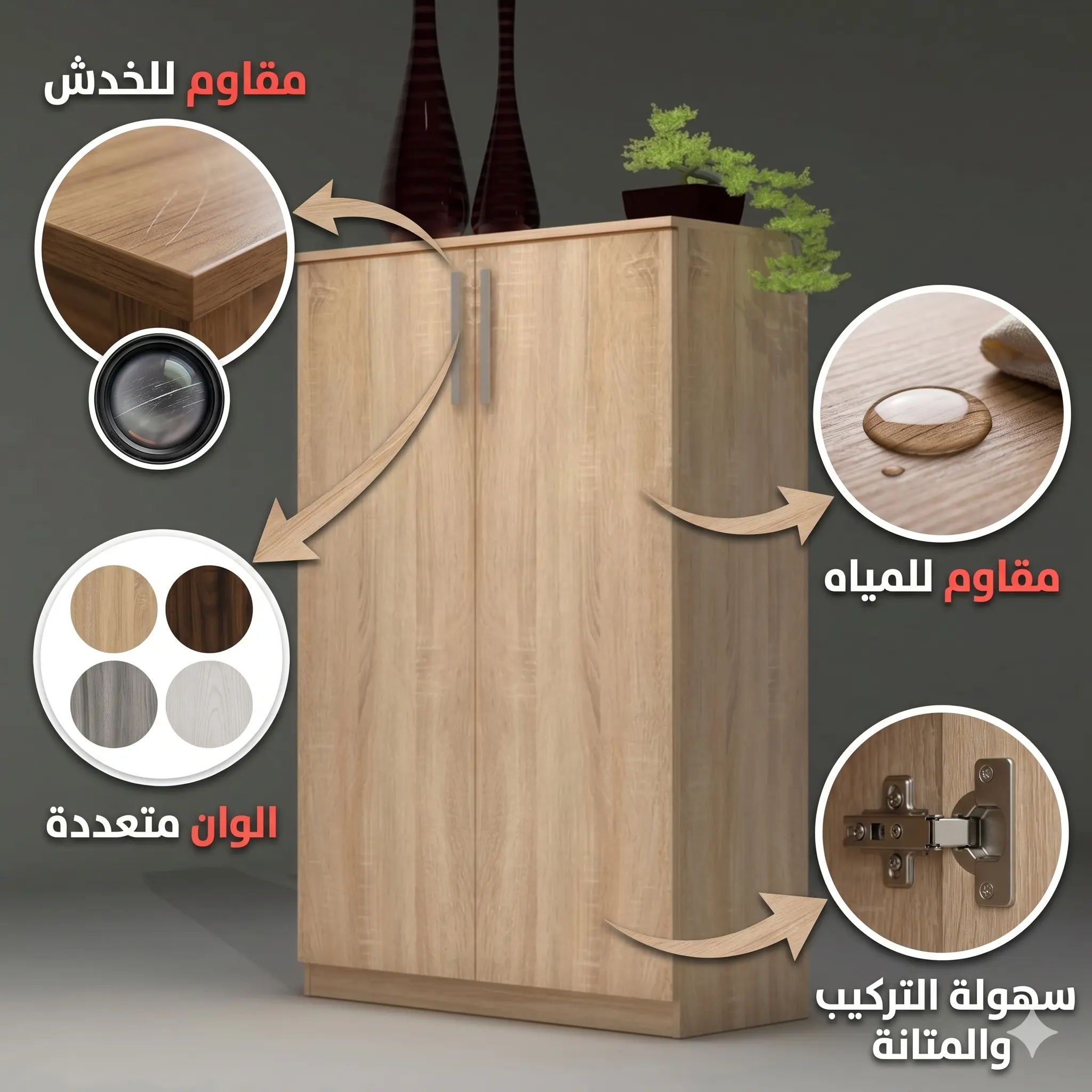 - خامات عالية الجودة: مصنوعة من خشب (MDF) عالي الجودة المقاوم للخدش والرطوبة، مما يضمن لك استدامة تدوم لسنوات.