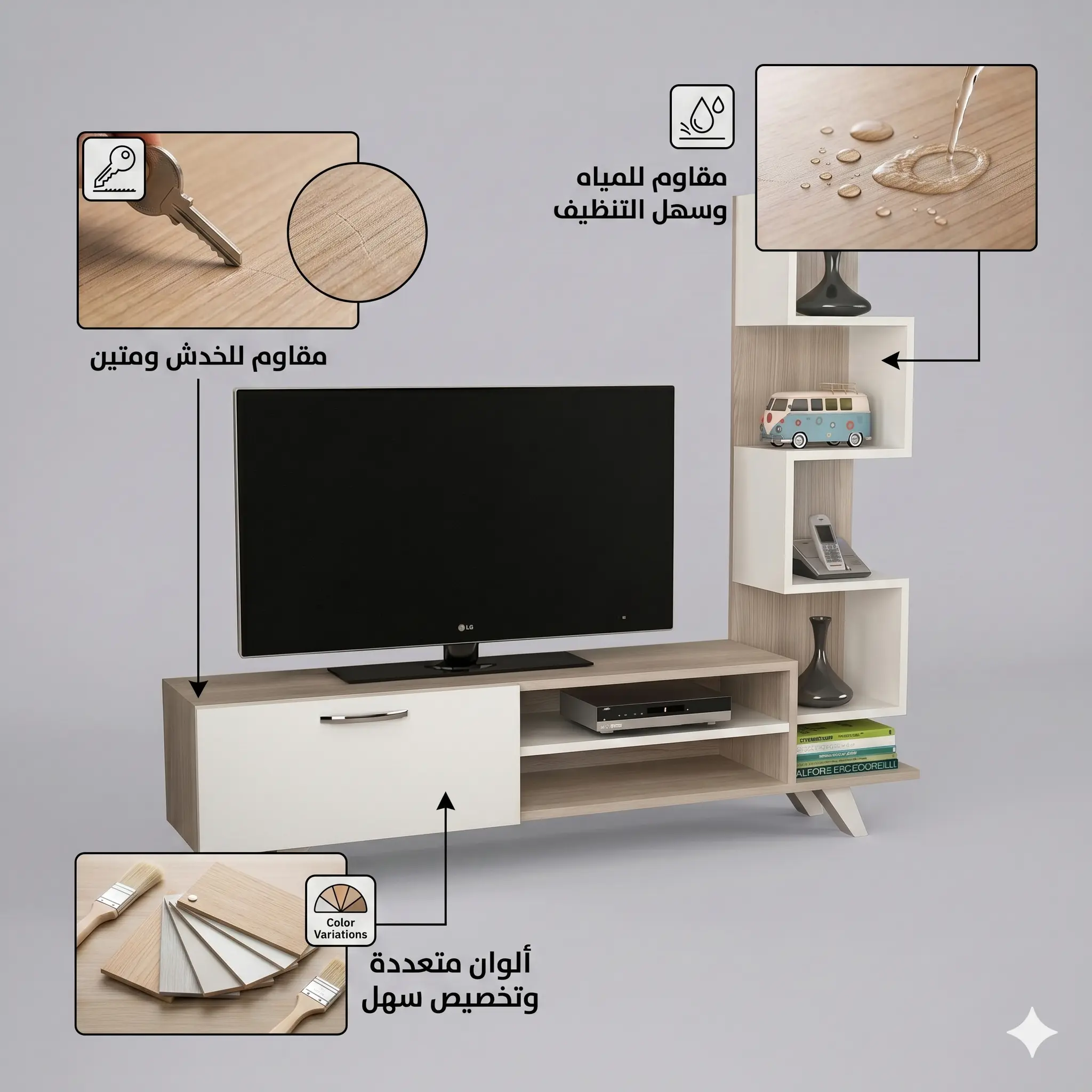 خامات شديدة التحمل: مصنوعة من خشب المقاوم للخدش والرطوبة لضمان عمر افتراضي طويل.