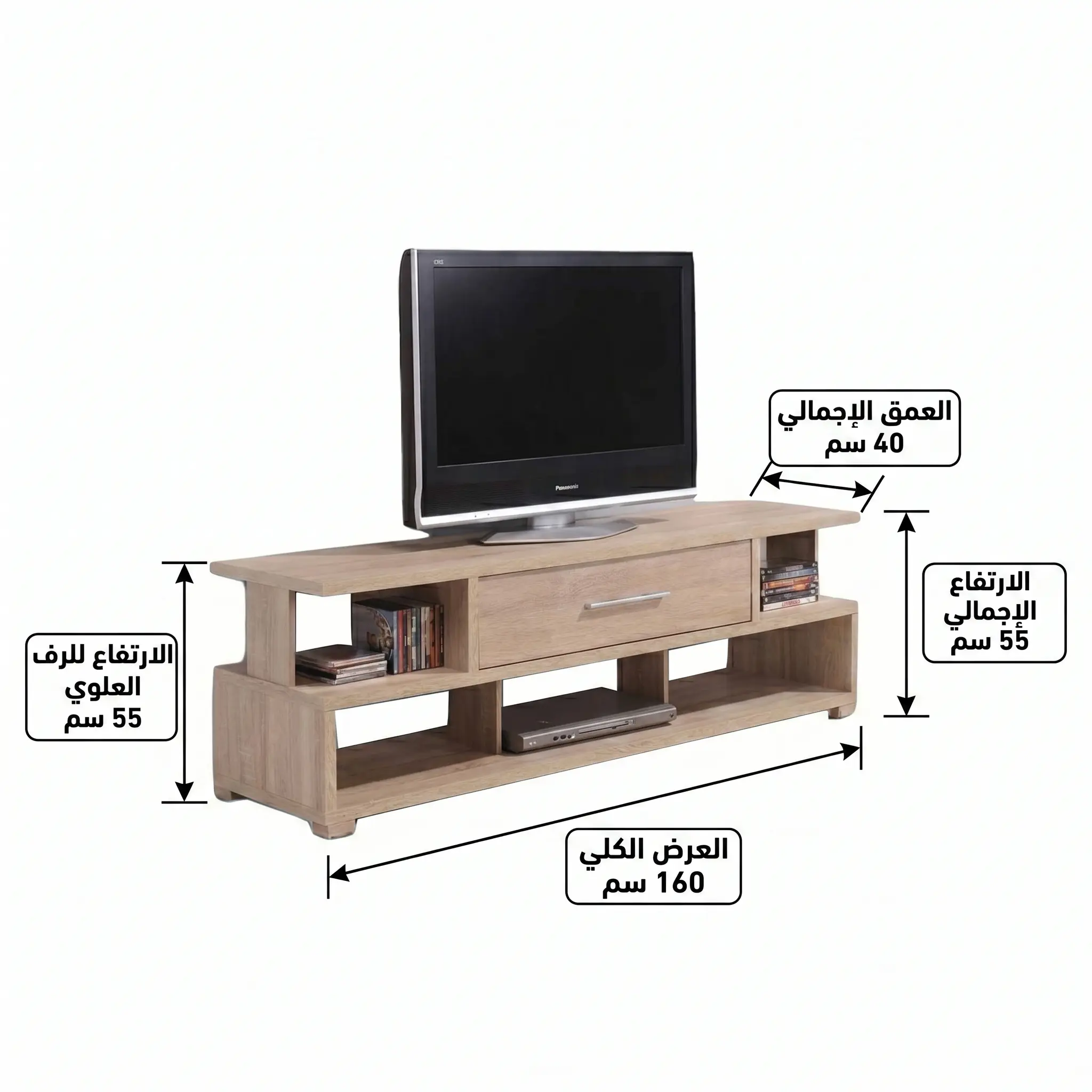 استغلال ذكي للمساحات: تحتوي على أرفف مفتوحة للأجهزة (الريسيفر، البلايستيشن) وأدراج/خزانات مغلقة لتنظيم الكابلات والمقتنيات الشخصية.