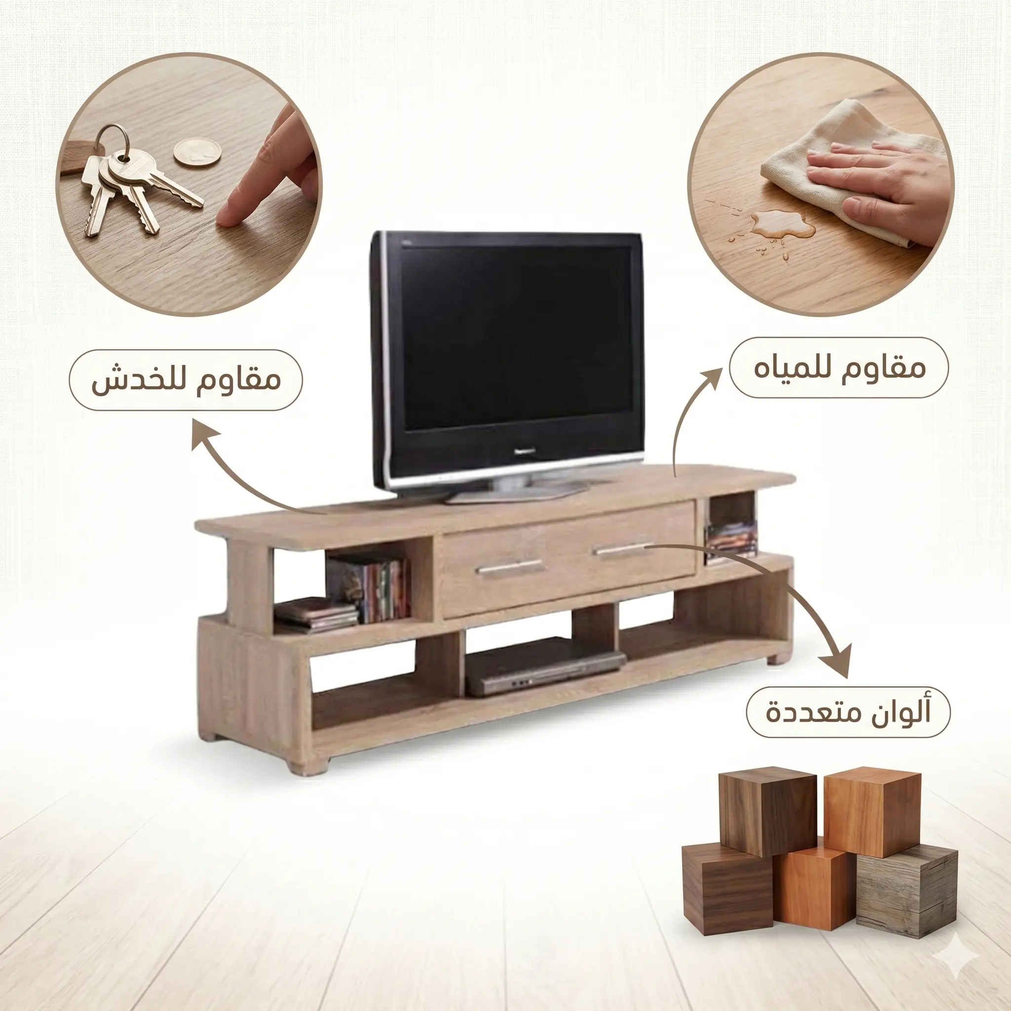 متانة فائقة: مصنوعة من خشب (MDF/HDF) عالي الجودة مع طبقة حماية من الميلامين المقاوم للخدش والرطوبة.