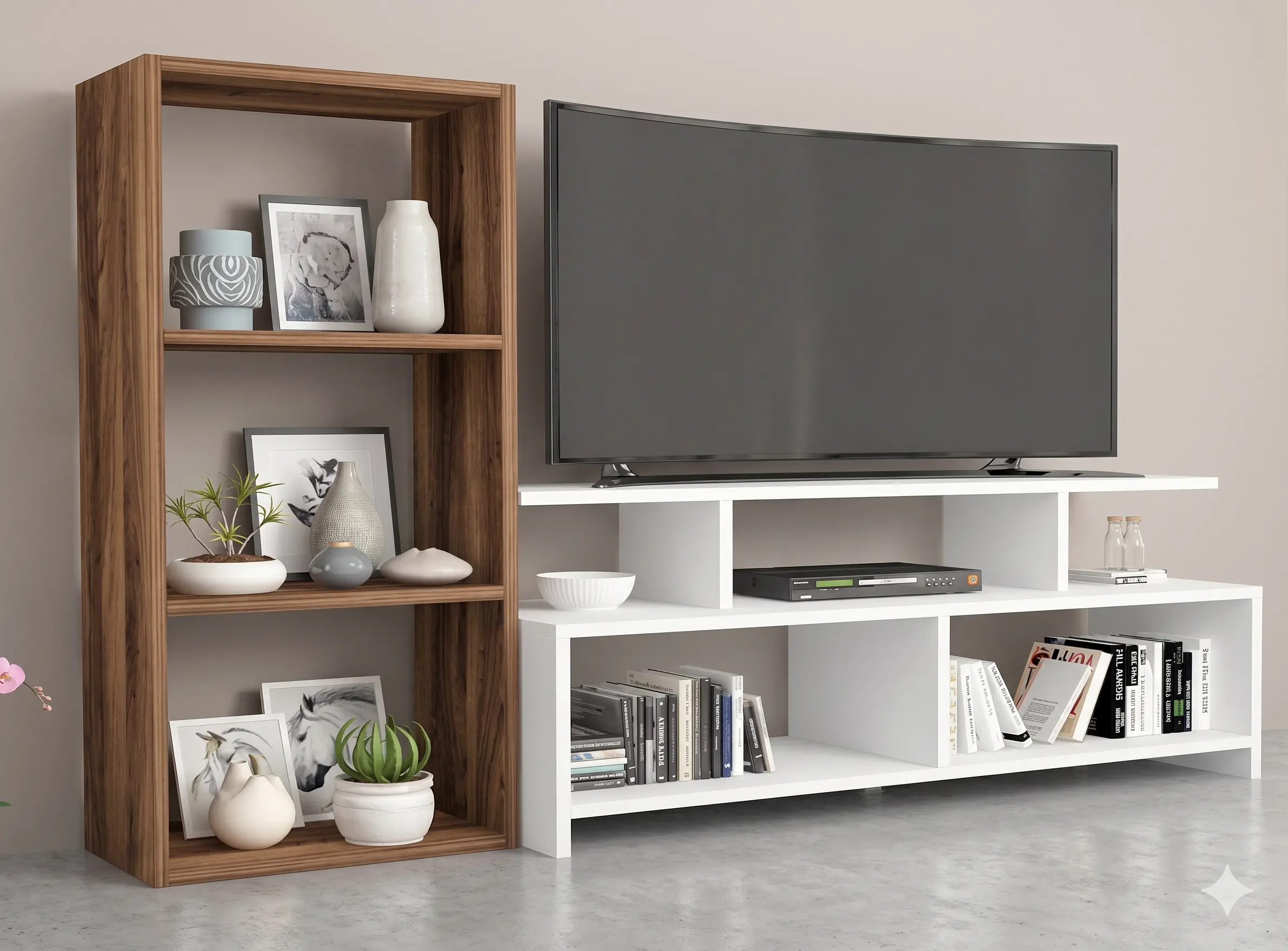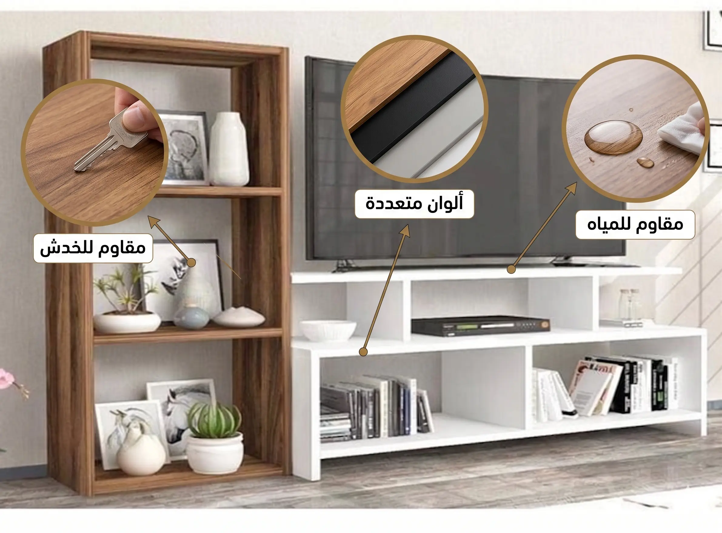 مساحة تخزين ذكية: تحتوي على أرفف وأدراج واسعة لتنظيم أجهزة الاستقبال، أجهزة الألعاب، والكتب بكل سهولة ومنع الفوضى.
