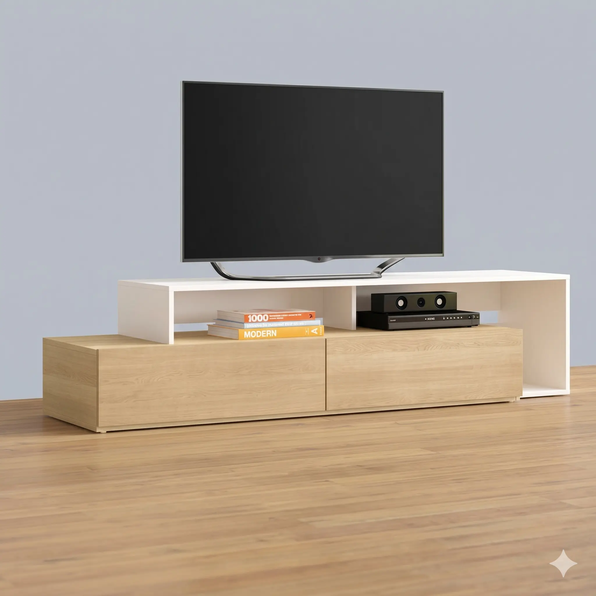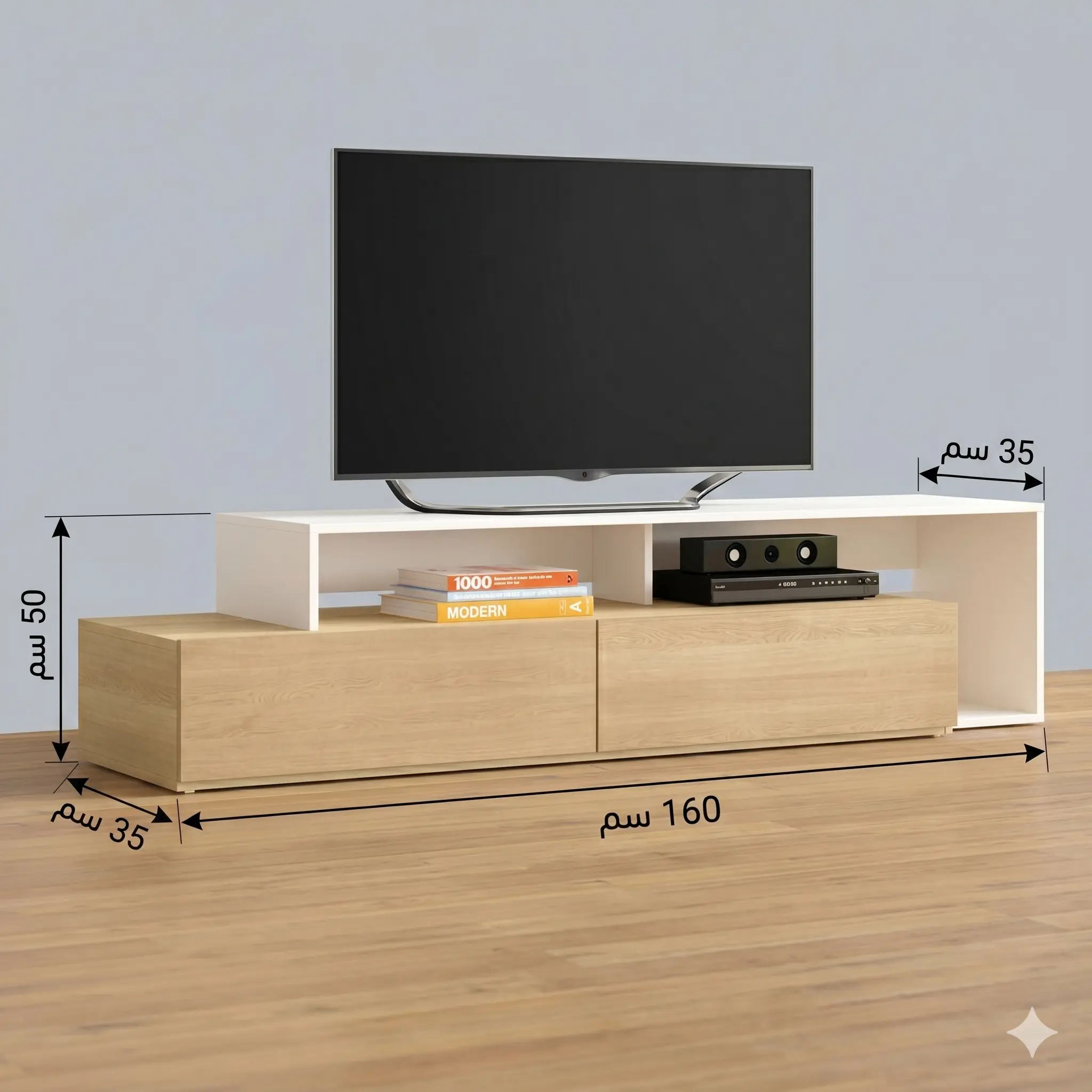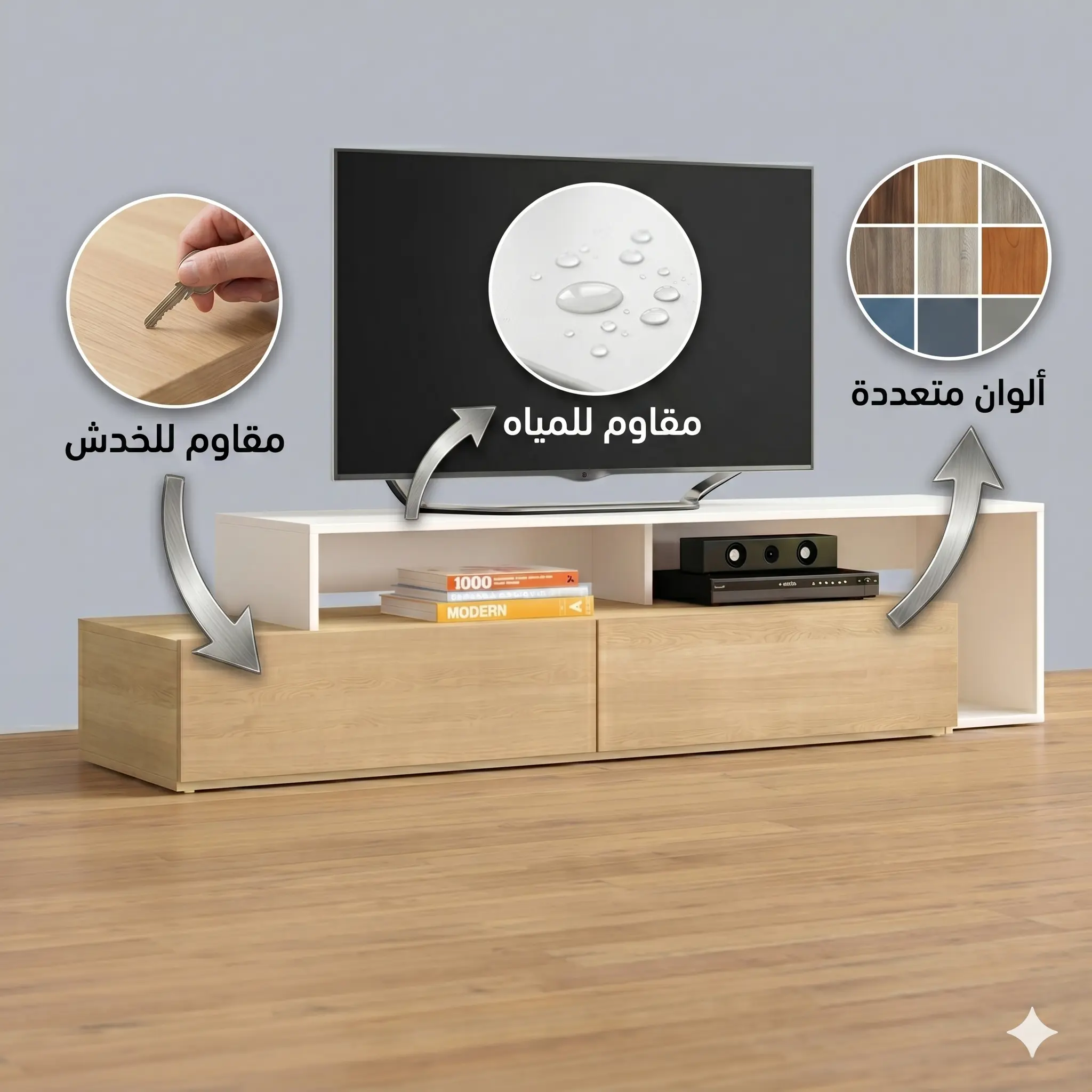 تنظيم ذكي: تحتوي على أرفف مفتوحة مثالية لأجهزة الاستقبال (الريسيفر) وأجهزة الألعاب، بالإضافة إلى أدراج/خزانات واسعة لتخزين المقتنيات.