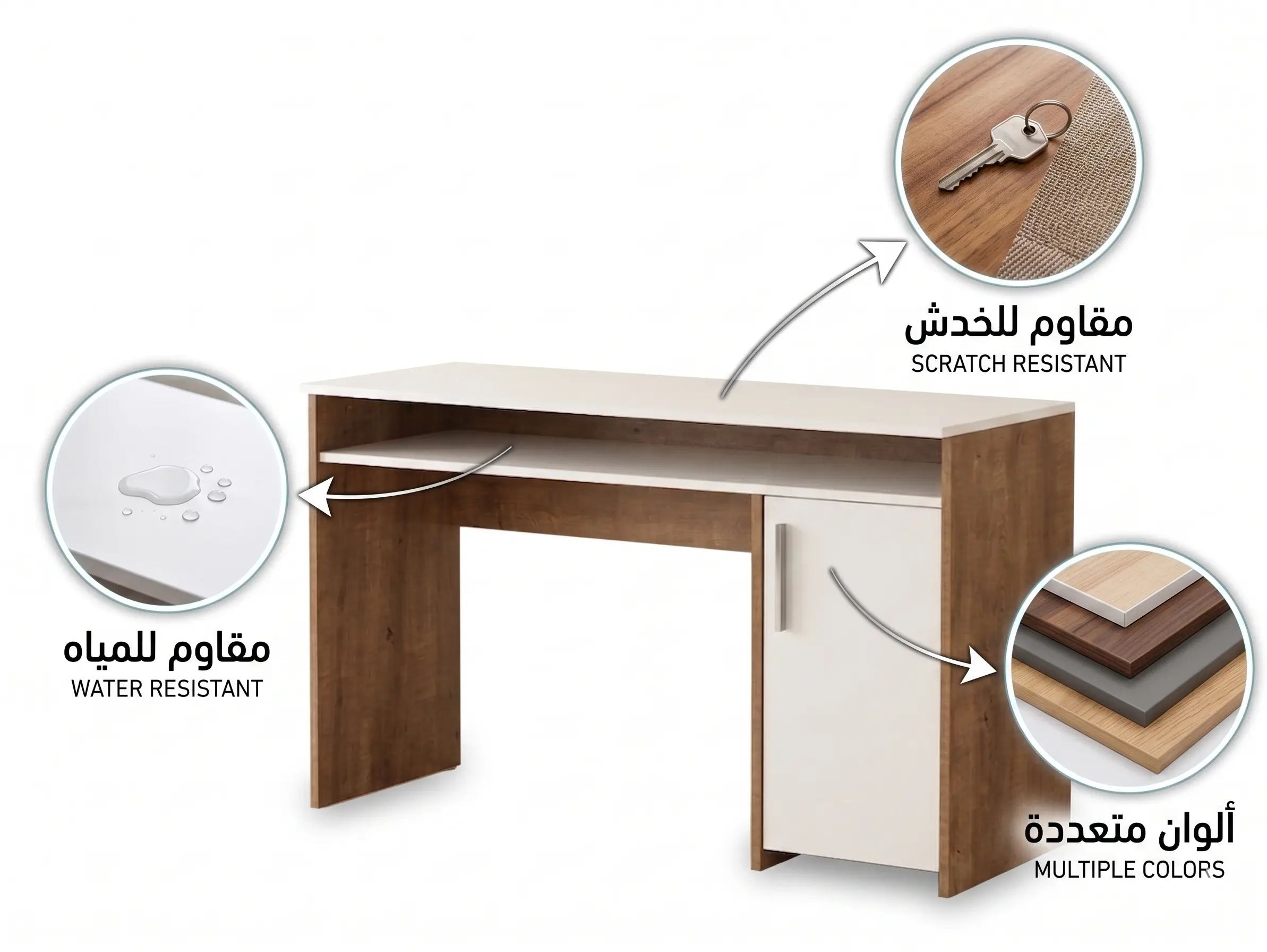 يتميز المكتب بتشطيب ناعم وألوان أنيقة تناسب جميع الديكورات الداخلية سواء الكلاسيكية أو المودرن، مما يجعله إضافة مثالية لغرف النوم أو المكاتب المنزلية.